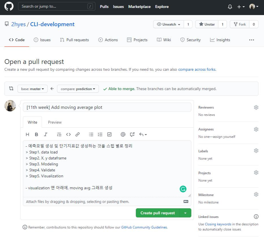 - pr 날릴 때, 보여줄 코멘트를 작성하고, create pull request.