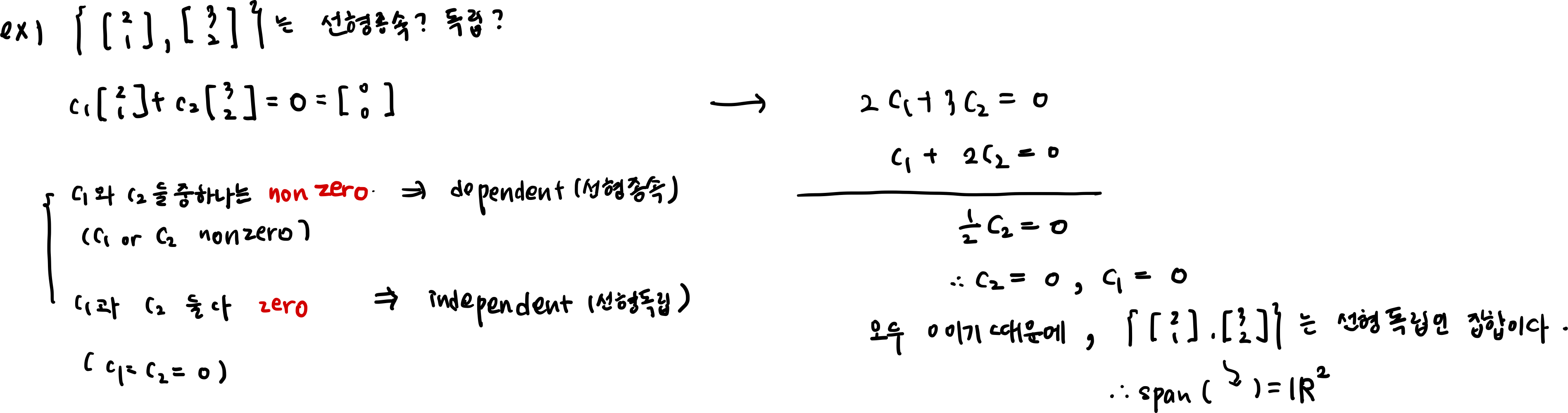 즉, \(\vec v_1)\를 다른 벡터의 결합으로 표현할 수 있으며, 해당 벡터들을 포함하는 집합은 linear dependent set이 된다.