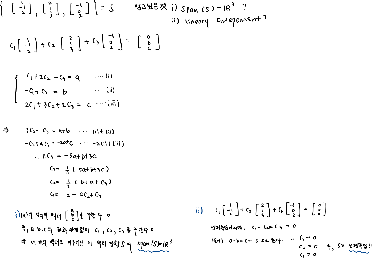 S가 Linear Independent하려면, 집합 S의 벡터들은 나머지 벡터들의 선형 결합으로 나타내지면 안된다.