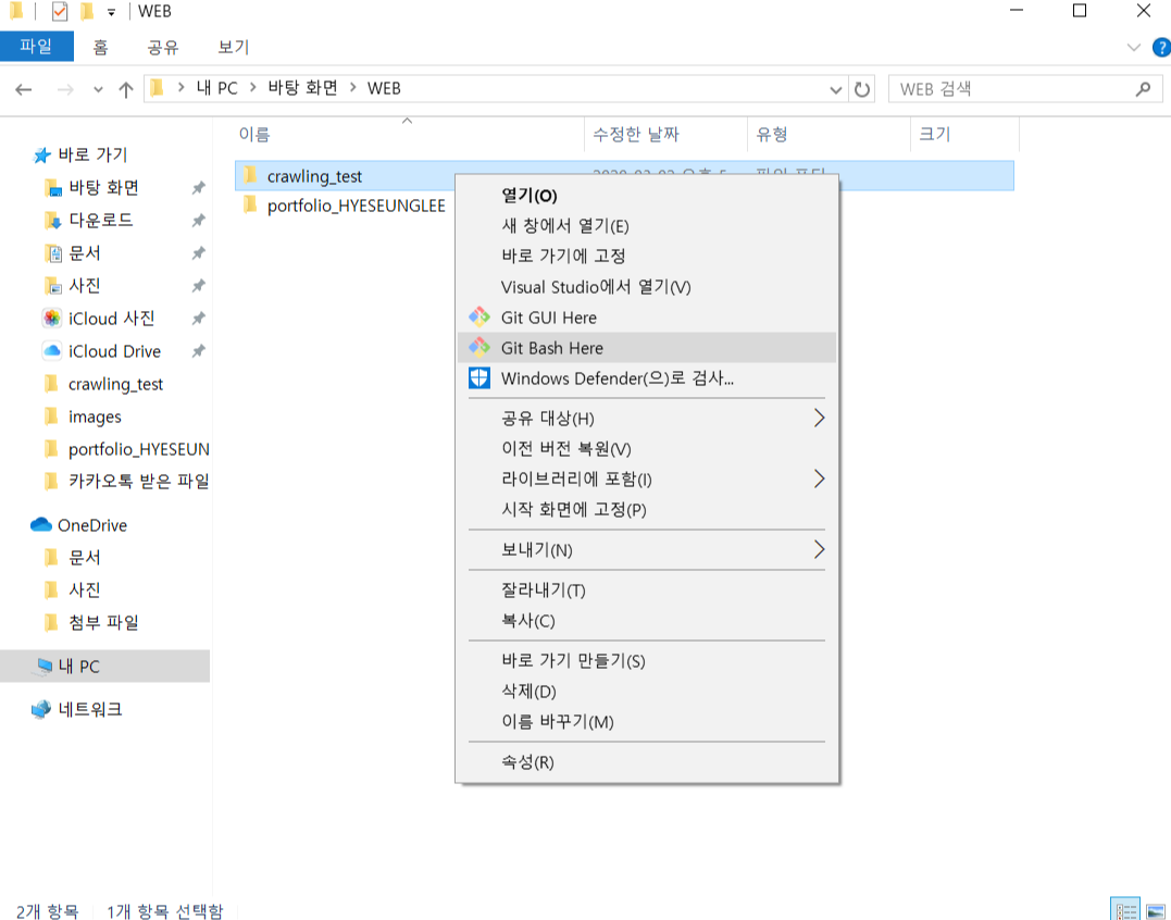 4. 로컬로 돌아와서, 프로젝트를 업로드하고싶은 폴더 우클릭> Git Bash Here